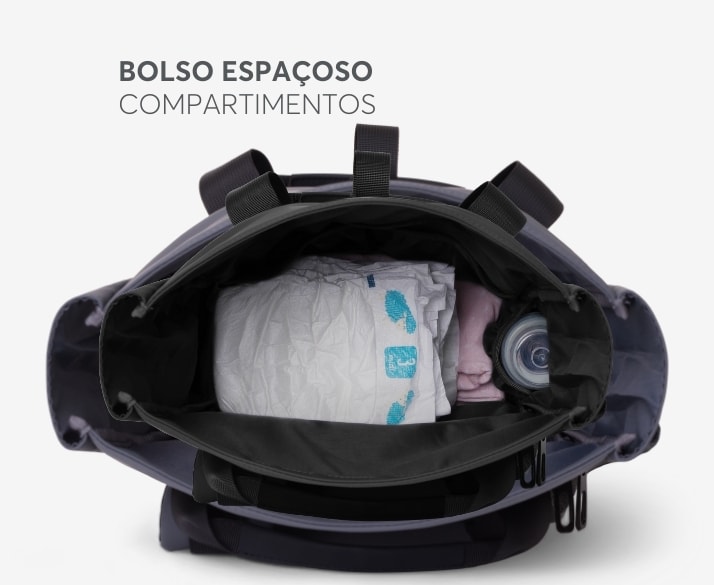 Bolsos organizadores, trocador e bolso resistente à água. Zíper traseiro permite acesso rápido, alça de bagagem facilita transporte.
