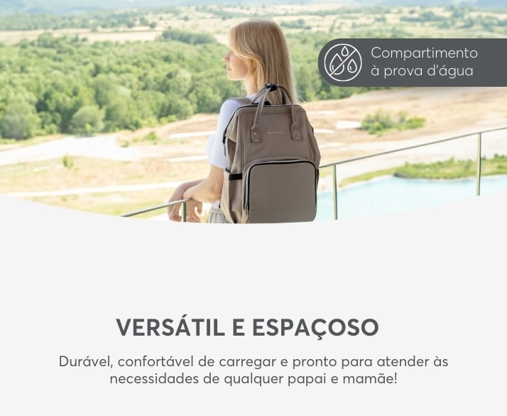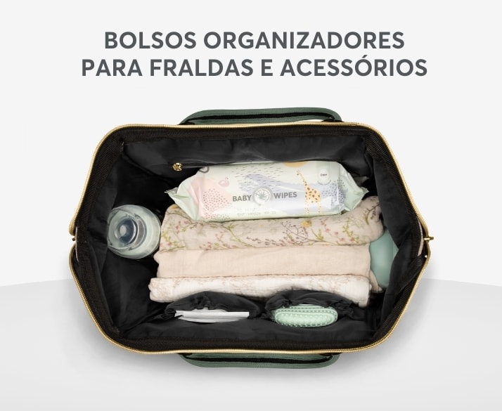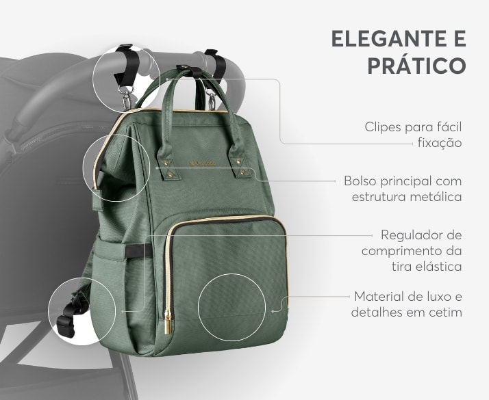 Feita de poliéster 100%, é resistente e prática. Inclui trocador e clipes para carrinho, tornando cada passeio mais seguro e organizado.