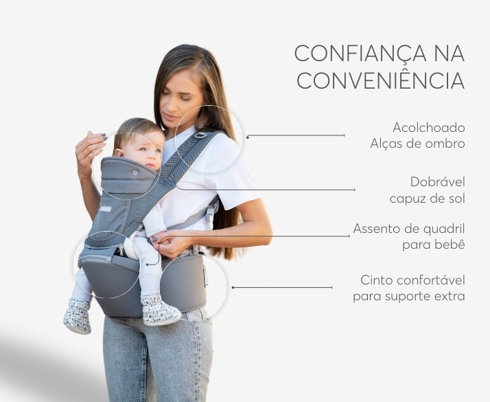 Produto 3 em 1 - pode ser usado separadamente como suporte macio, assento de quadril ou acoplado como suporte com assento de quadril. Inclui capota solar removível, bolso frontal adicional e material em malha respirável. Embalagem luxuosa em caixa para presente, perfeita para mimos especiais.