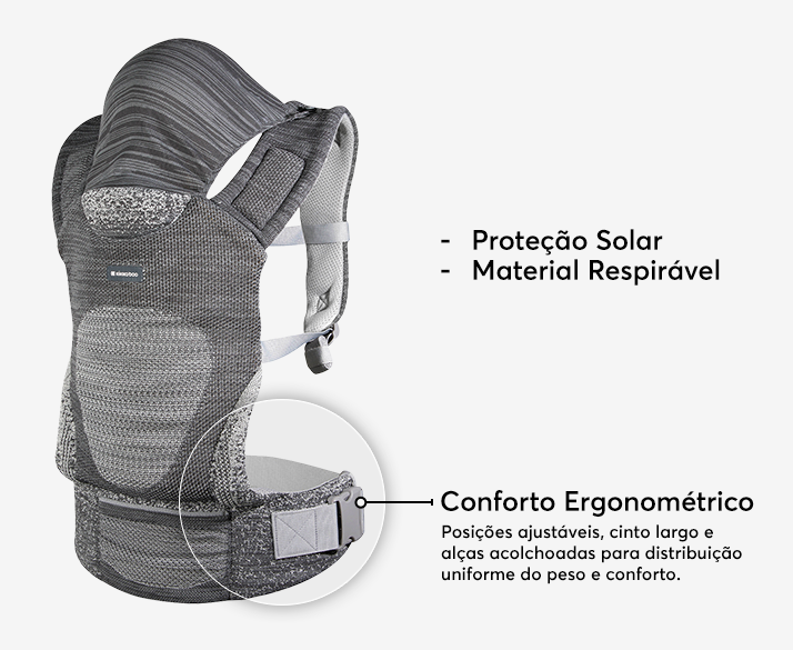O canguru HOODY oferece conforto e estilo com 3 posições: pais e frente (4-24 meses) e costas (6-24 meses). Com cinto largo e alças acolchoadas, distribui o peso uniformemente. Inclui protetores macios e capuz dobrável para proteção solar, em material respirável e suave.