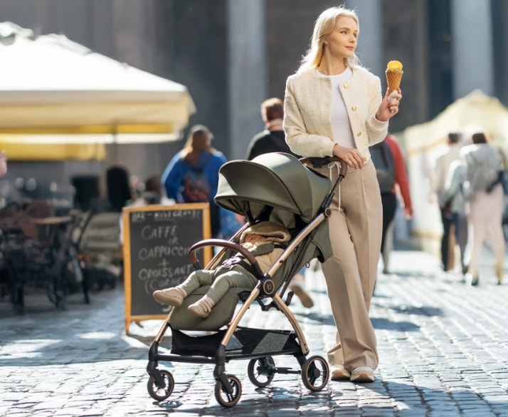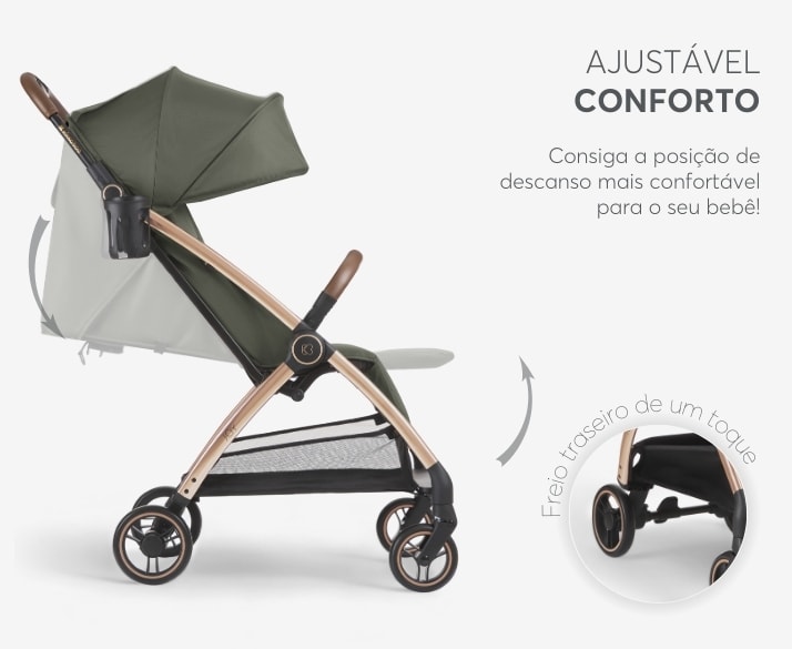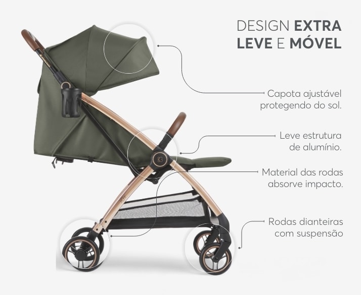 Adequado desde o nascimento até aos 22 kg, com estrutura leve em alumínio e sistema de fechamento automático de um toque para máxima praticidade.