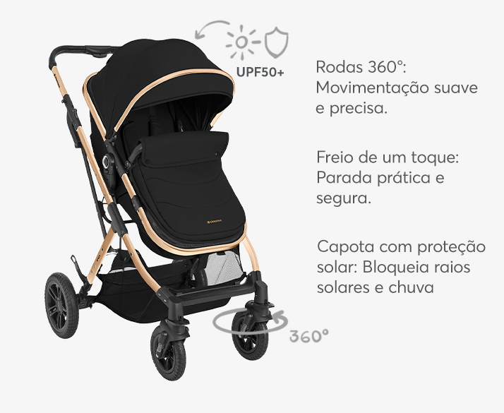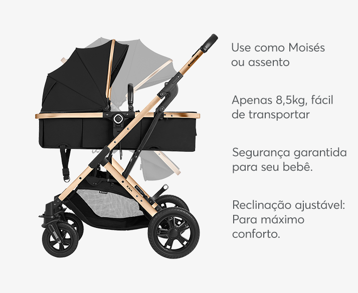 Descubra o carrinho KAIA 3 em 1, a solução que acompanha seu filho do nascimento até 22kg. Economize com um produto que se transforma conforme seu bebê cresce. Moisés conversível, assento reclinável multidirecional e sistema de cinto 5 pontos com certificação Inmetro. Tecidos impermeáveis UPF50+ protegem em qualquer clima.