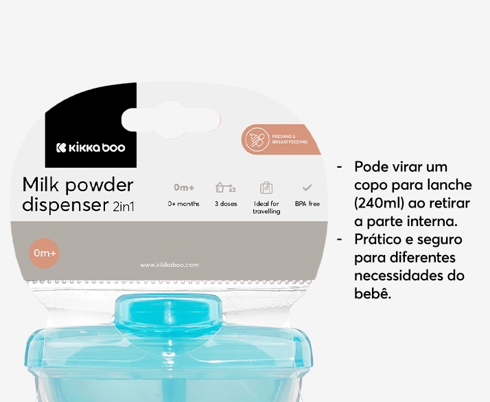 O pote para leite em pó combina três compartimentos para doses pré-medidas, facilitando a alimentação fora de casa. O design compacto e conversível permite transformá-lo rapidamente em um copo para lanches de 240ml, acompanhando as diferentes necessidades do bebê durante o crescimento.