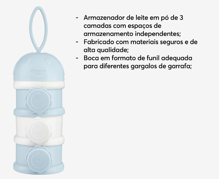 O dispenser de leite em pó com 3 camadas oferece armazenamento fresco, prático e seguro para o leite em pó do seu bebê. Ideal para facilitar a rotina de pais ocupados, ele mantém cada dose organizada, pronta para uso em casa, passeios e viagens, ativando o gatilho da compra de quem busca agilidade e organização.