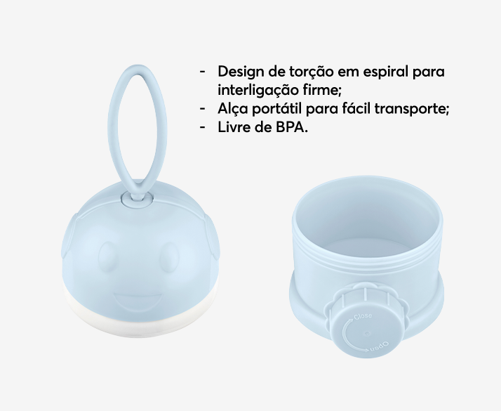 Com três compartimentos independentes e boca em formato de funil, evita derramamentos ao transferir o pó para qualquer garrafa. Produzido em material resistente, livre de BPA, garante a segurança do bebê. O sistema de encaixe espiral mantém tudo firme e a alça portátil facilita o transporte, tornando alimentar seu filho muito mais fácil em qualquer lugar.